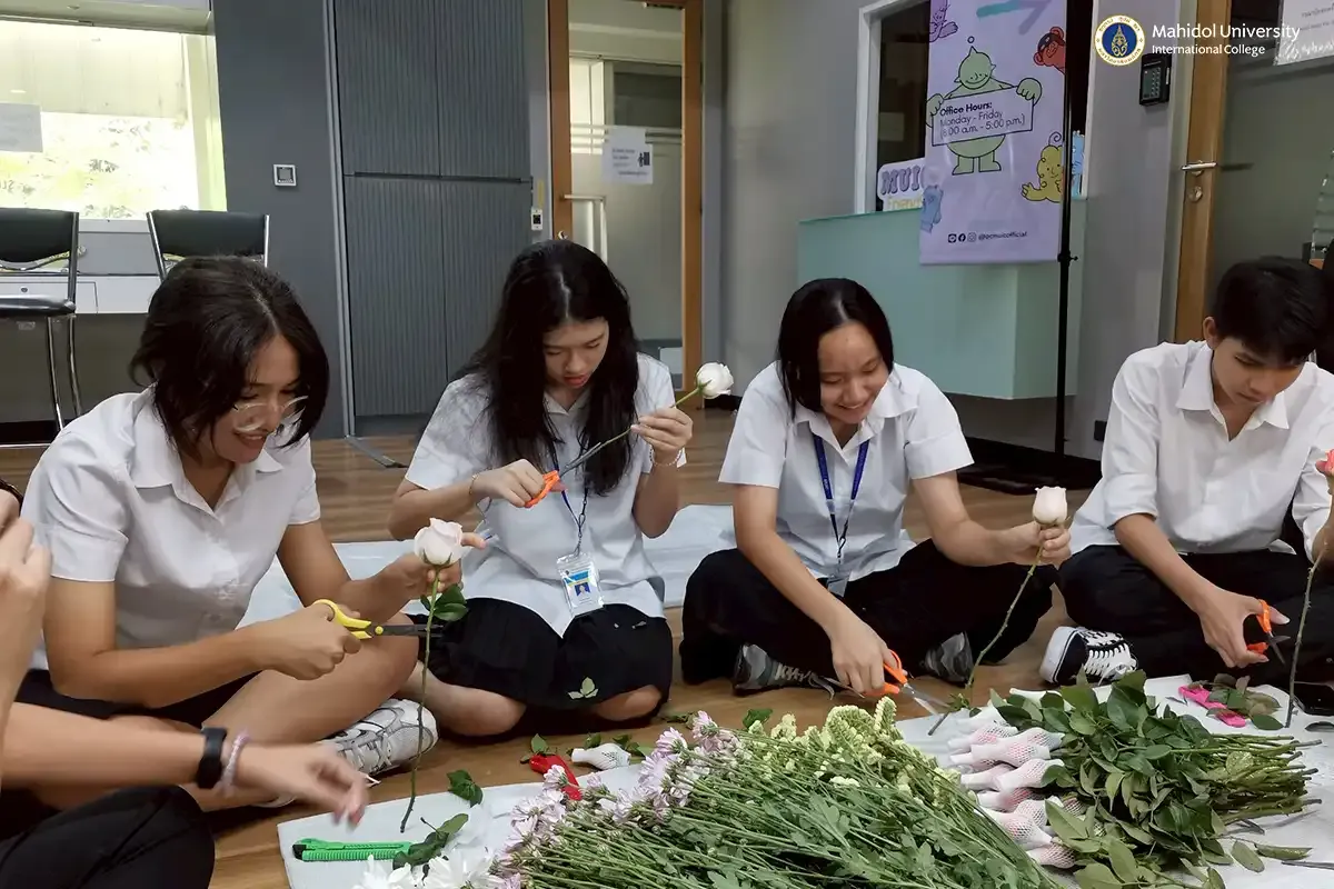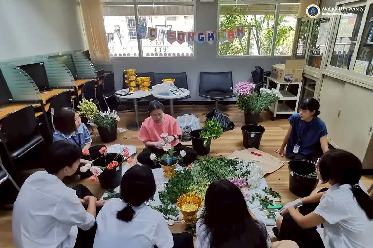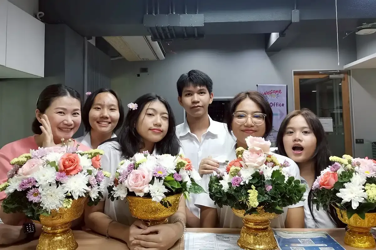 The previous day, both Thai and non-Thai students enjoyed a fun and relaxing flower arrangement activity for Songkran at the PC office. It was a great chance for them to try something new and creative, learn about Thai flower-arranging traditions, and enjoy time with peers in a relaxed atmosphere.