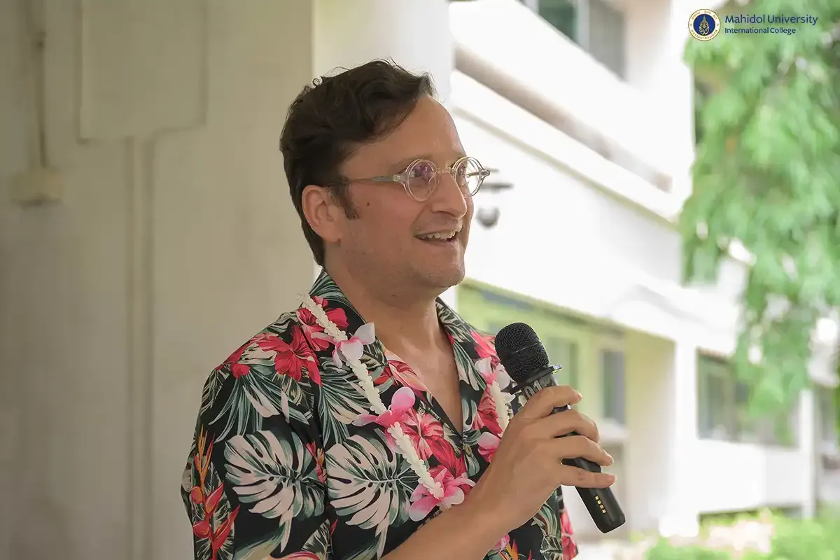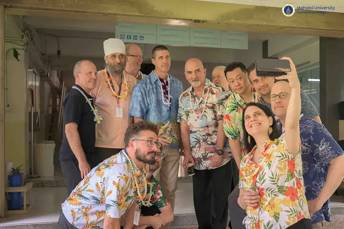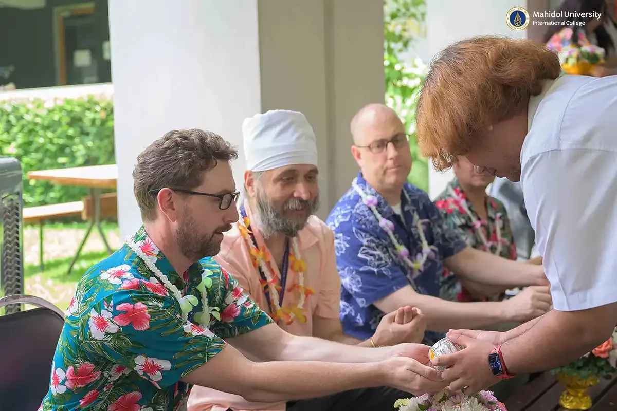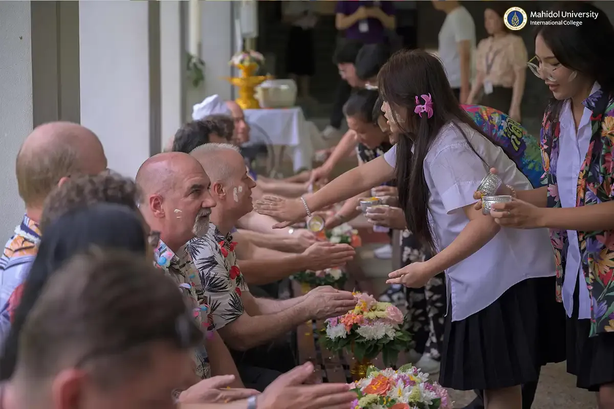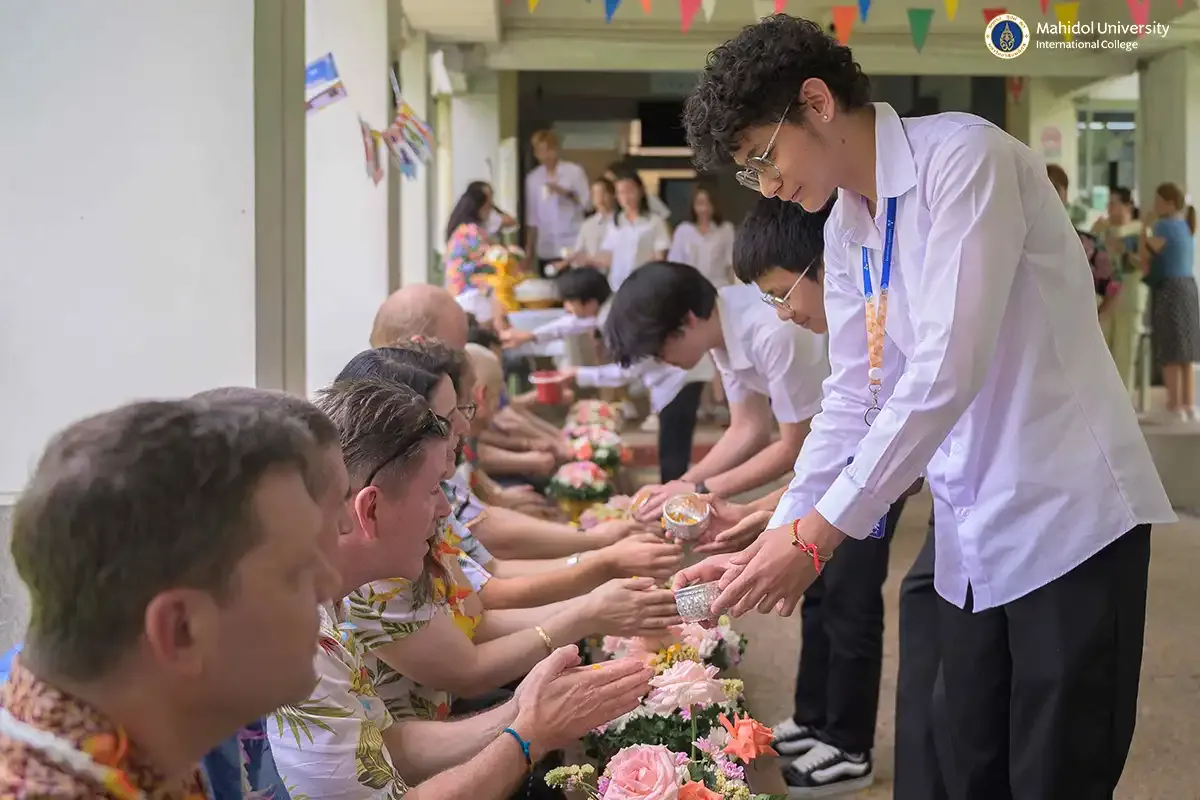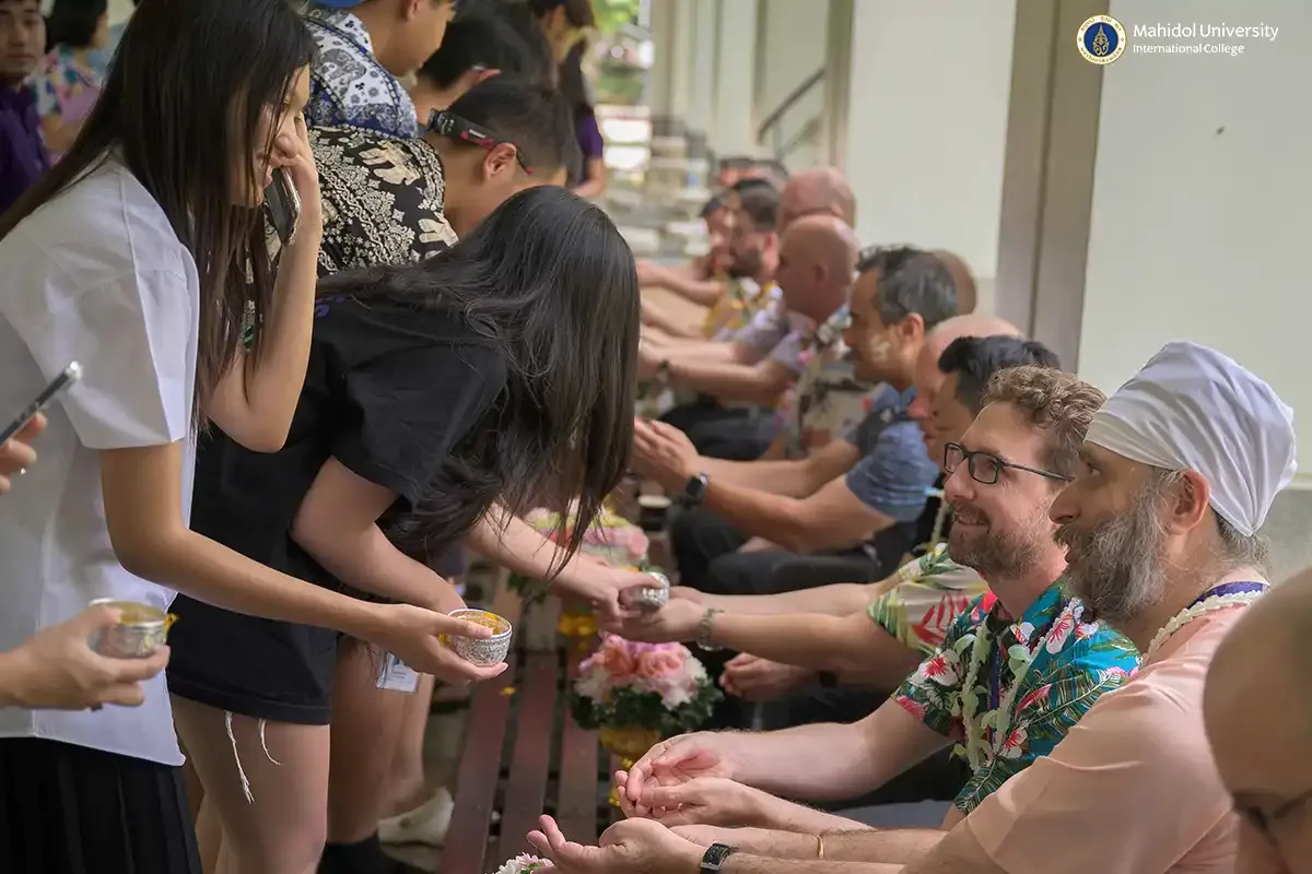 As part of the vibrant celebrations for Songkran, which is Thailand's traditional New Year's festival, PC students participated in the heartwarming and respectful tradition of pouring water on instructors to seek blessings. They experienced this along with staff members and fellow PC classmates on Friday, April 11, 2025 in the covered walkway of MUIC Building 2.