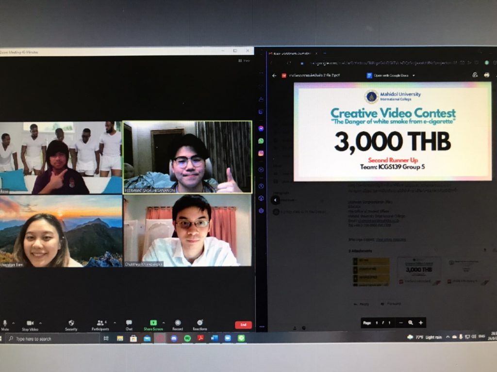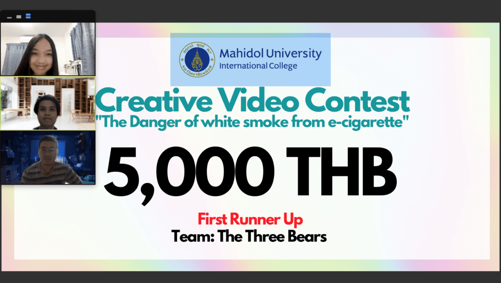 The Office of Student Affairs of Mahidol University International College (MUIC) held a video contest entitled “The Danger of White Smoke from E-cigarette” from May 13 to July 29, 2021.