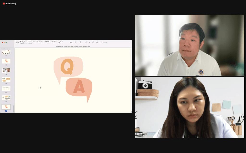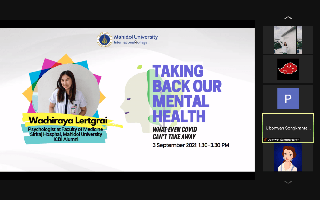 Mahidol University International College’s (MUIC) Office of Student Affairs held an online event called “Taking Back Our Mental Health” on September 3, 2021 from 1:30 to 3:30 pm via Zoom.