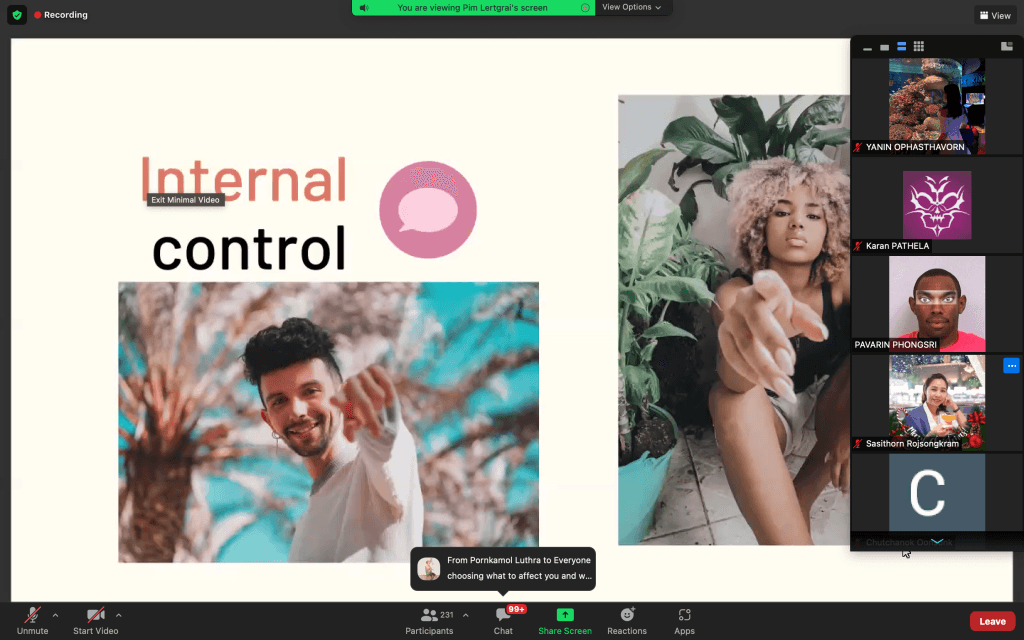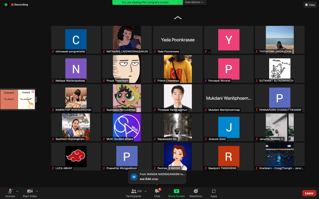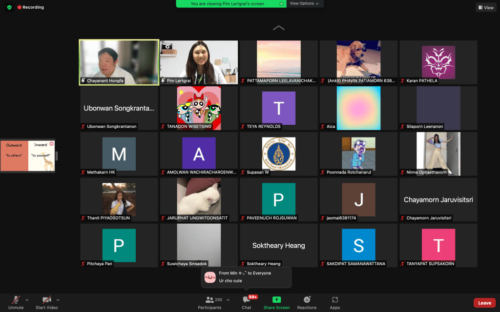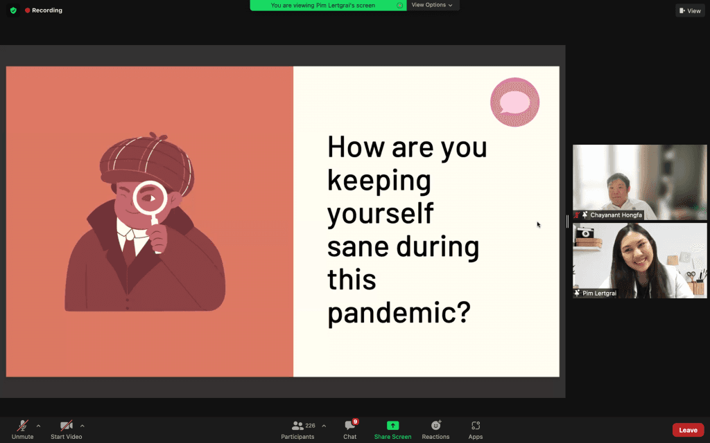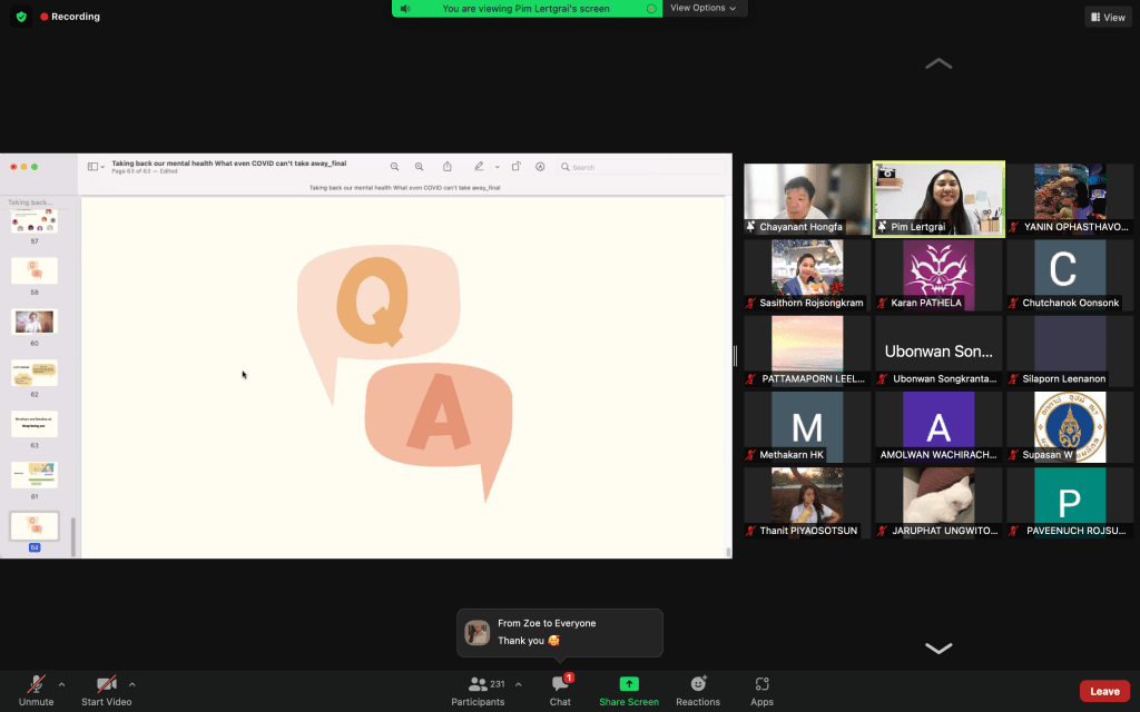 Ms. Wachiraya divided the lecture into two main parts: communication and emotional control. During the session, the speaker shared her past experiences, techniques, and recommendations on how to keep ourselves mentally healthy during the pandemic. The session concluded with a question-and-answer session.