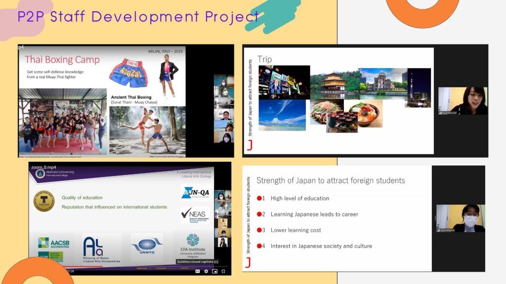 Mahidol University International College’s (MUIC) Project Development Unit (PDU) and Human Resources Development Unit collaborated with Chiba University International Student Division (CU-ISD), Japan in organizing the P2P Staff Development Project Session 4 on January 28, 2022, with the topic “Strength of Japan and Thailand to attract foreign students” on an online platform.