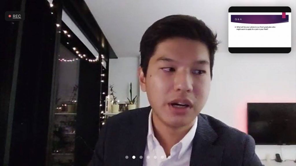 There were two Virtual Talk Sessions featuring selected MUIC alumni and special guest speakers. Session 1’s topic was “Job Hunting Tricks during the Crisis” while Session 2 was about “Path for Career Success.” In the latter, graduates were able to choose a session with the topic that they were interested in: “Current Job Opportunities for BA Graduates—Experiences from Two Sides of the Same Coin” by Business Administration Division, “Career for Science Students in the Health Industry” by Science Division, “MUIC Student Internships and Possible Career Opportunities” by Humanities and Language Division, “Secret Paths for Career Success: The Next-Normal Business” by THM Division, “IRGA Careers and Global Engagement” by Social Science Division, and “Building a Tech Startup in Thailand” by FAA Division.
