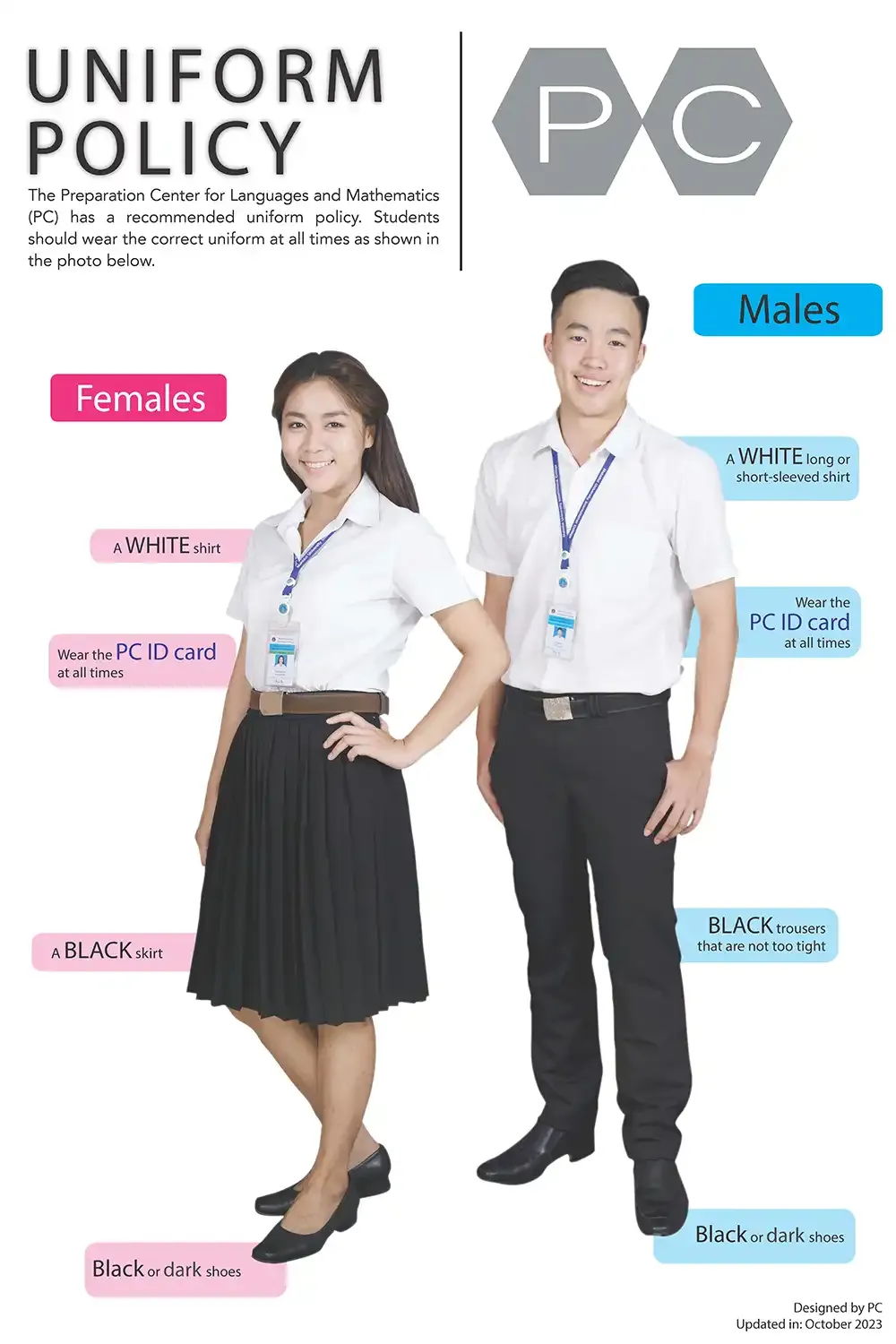 The Preparation Center for Languages and Mathematics (PC) has a recommended uniform policy. Students should wear the correct uniform at all times as per the details below