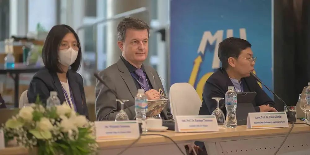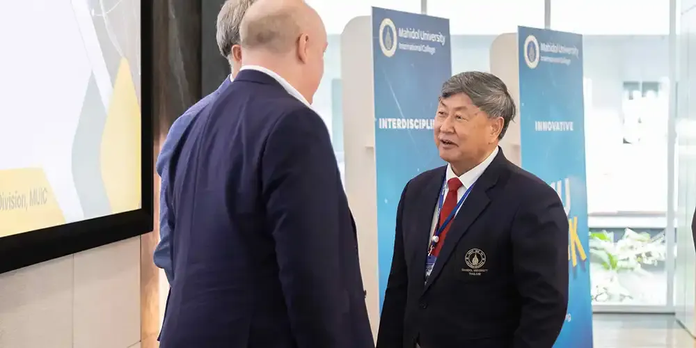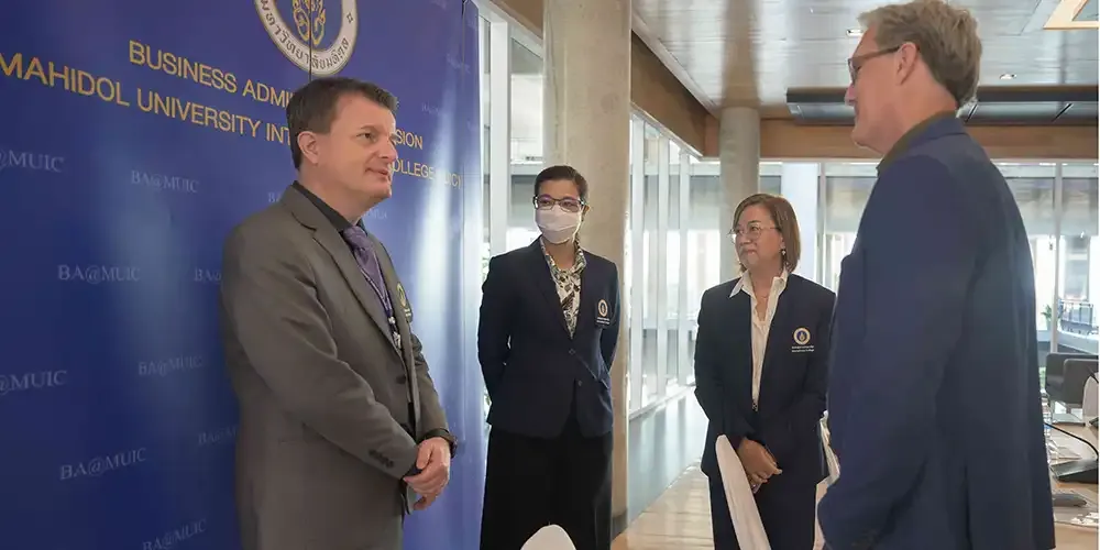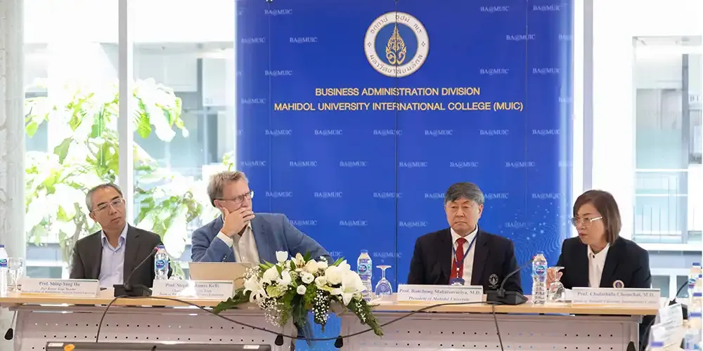 วันที่ 12 มีนาคม 2567 ศาสตราจารย์ นายแพทย์บรรจง มไหสวริยะ อธิการบดีมหาวิทยาลัยมหิดล และศาสตราจารย์ แพทย์หญิงจุฬธิดา โฉมฉาย คณบดีวิทยาลัยนานาชาติ มหาวิทยาลัยมหิดล พร้อมด้วยผู้บริหาร คณาจารย์กลุ่มสาขาวิชาบริหารธุรกิจ วิทยาลัยนานาชาติ มหาวิทยาลัยมหิดล ร่วมรับฟังผลการประเมินการรับรองคุณภาพทางการศึกษาด้านบริหารธุรกิจและการบัญชีทั่วโลก (Association to Advance Collegiate Schools of Business: AACSB) จาก คณะกรรมการประเมิน Peer Review Team นำโดย Prof. Stephen Kelly, Dean of the Business School จาก Massey University Prof. Shing-yang Hu, Dean of College Management จาก National Taiwan University และ Prof. Michael Johnson-Cramer, Dean of the Business School จาก Ithaca College ที่เข้าตรวจประเมินระหว่างวันที่ 10 – 12 มีนาคม 2567 โดยมีวัตถุประสงค์เพื่อประเมินคุณภาพการศึกษาของกลุ่มสาขาวิชาบริหารธุรกิจ วิทยาลัยนานาชาติ มหาวิทยาลัยมหิดล ตามมาตรฐานของ AACSB ณ ห้องจรินทร์ยารัศมิ์ อาคารอทิตยาทร วิทยาลัยนานาชาติ มหาวิทยาลัยมหิดล