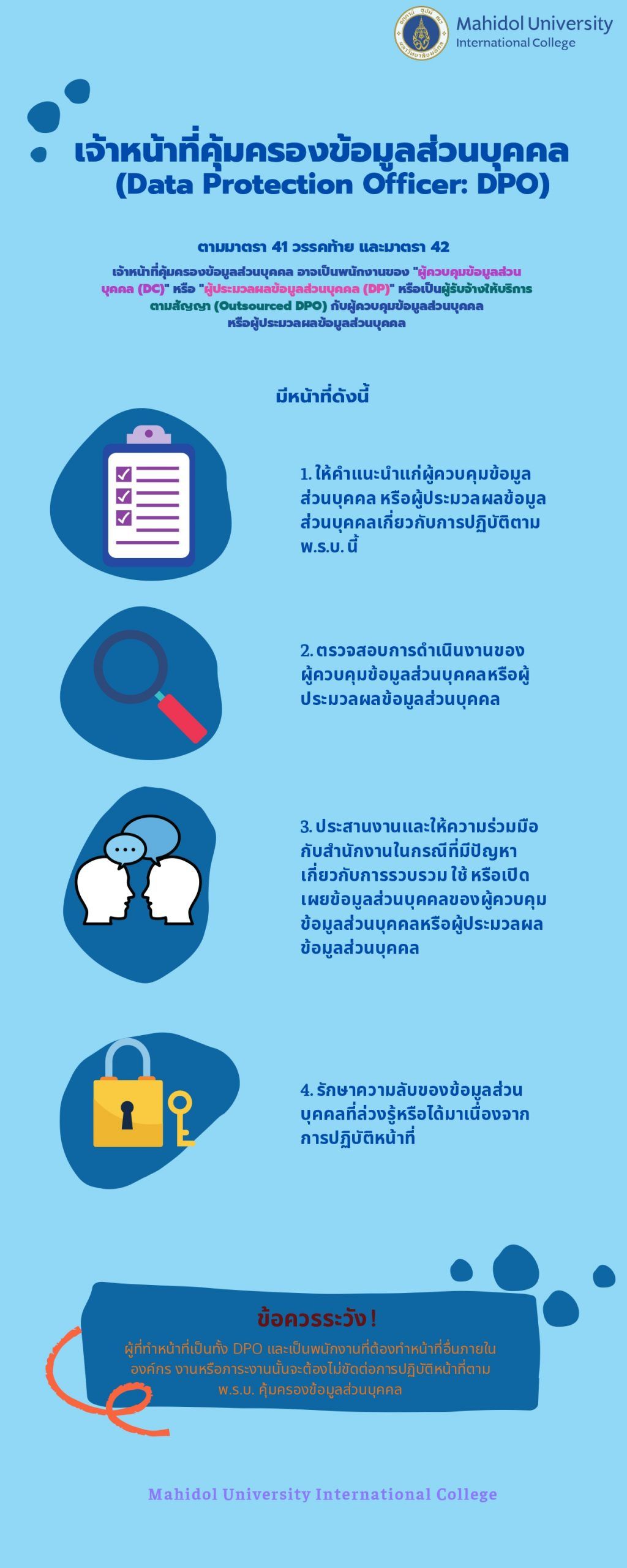 - รักษาความลับของข้อมูลส่วนบุคคลที่ล่วงรู้หรือได้มาเนื่องจากการปฏิบัติหน้าที่