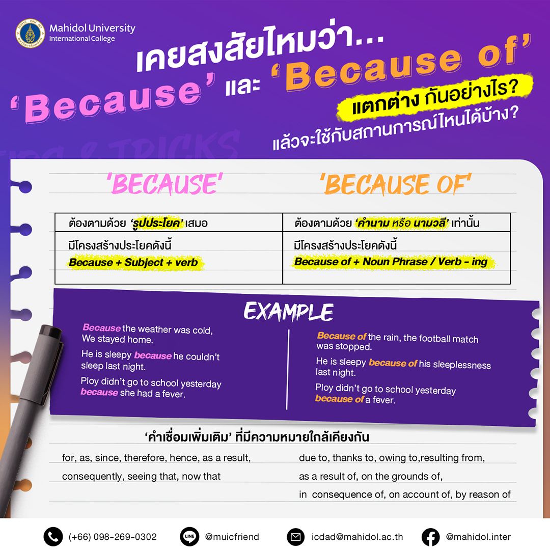 …. คำว่า ‘Because’ และ ‘Because of’ จัดอยู่ในกลุ่มของคำสันธาน ( Conjunction ) ที่มีความหมายที่คล้ายๆ นั่นก็คือ “เพราะว่า, เนื่องจาก” แต่แท้จริงแล้วคำทั้ง คำนี้มีความแตกต่างกันอยู่ ซึ่งมีหลักการใช้ง่ายๆ ดังต่อไปนี้