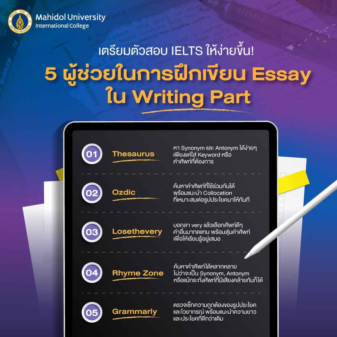 หมดกังวลกับปัญหาเดิมๆ ที่กวนใจ เพราะวันนี้ MUIC จะมาแนะนำ “5 ผู้ช่วยที่จะทำให้การเขียน Essay ง่ายขึ้นกว่าเดิม” เพื่อพัฒนาการเขียนและเสริมความมั่นใจให้กับน้องๆ ที่กำลังเตรียมตัวในการสอบได้อัปเกรดฝีมือได้มากขึ้น จะมีตัวช่วยไหนบ้างไปดูกันเลย