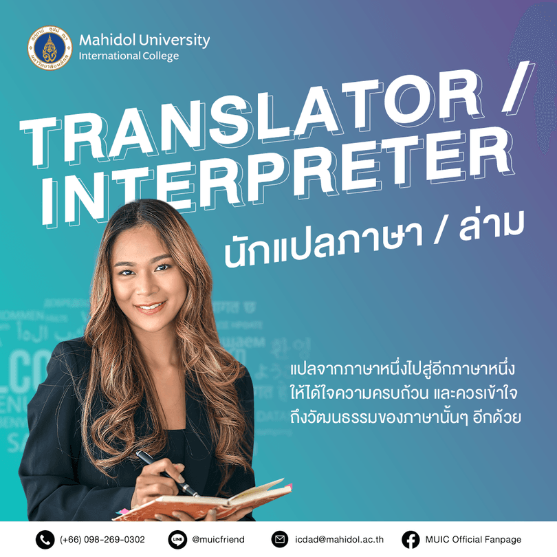 “นักแปลภาษา / ล่าม” อย่างแน่นอน ซึ่งอาชีพนี้ทำหน้าที่แปลจากภาษาหนึ่งไปสู่อีกภาษาหนึ่งและมีด้วยกันหลากหลายรูปแบบ ไม่ว่าจะเป็นล่ามพูดตาม, ล่ามกระซิบ และล่ามพูดพร้อม นอกจากจะต้องใช้ความถนัดด้านภาษาต่างประเทศที่ MUIC ยังพัฒนาให้น้องๆ นักศึกษามีความเข้าใจถึงวัฒนธรรมของภาษานั้นๆ ได้เป็นอย่างดีอีกด้วย