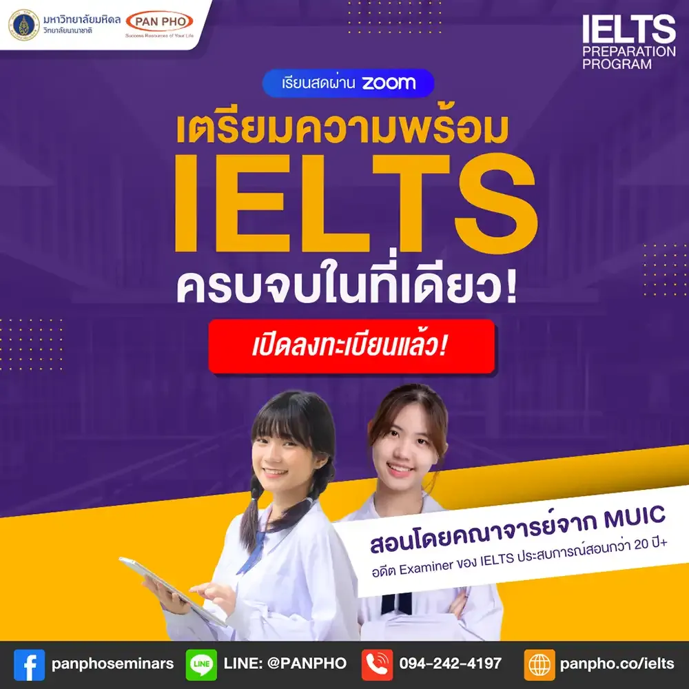 ด่วน! ที่นั่งมีจำนวนจำกัด ผู้ที่สนใจสามารถสมัครและชำระเงินค่าเรียนได้แล้ววันนี้ผ่านทาง Website: www.panpho.co/ielts หรือผ่านทาง LINE: @PANPHO (ตลอด 24 ชั่วโมง) หรือ 094-242-4197
