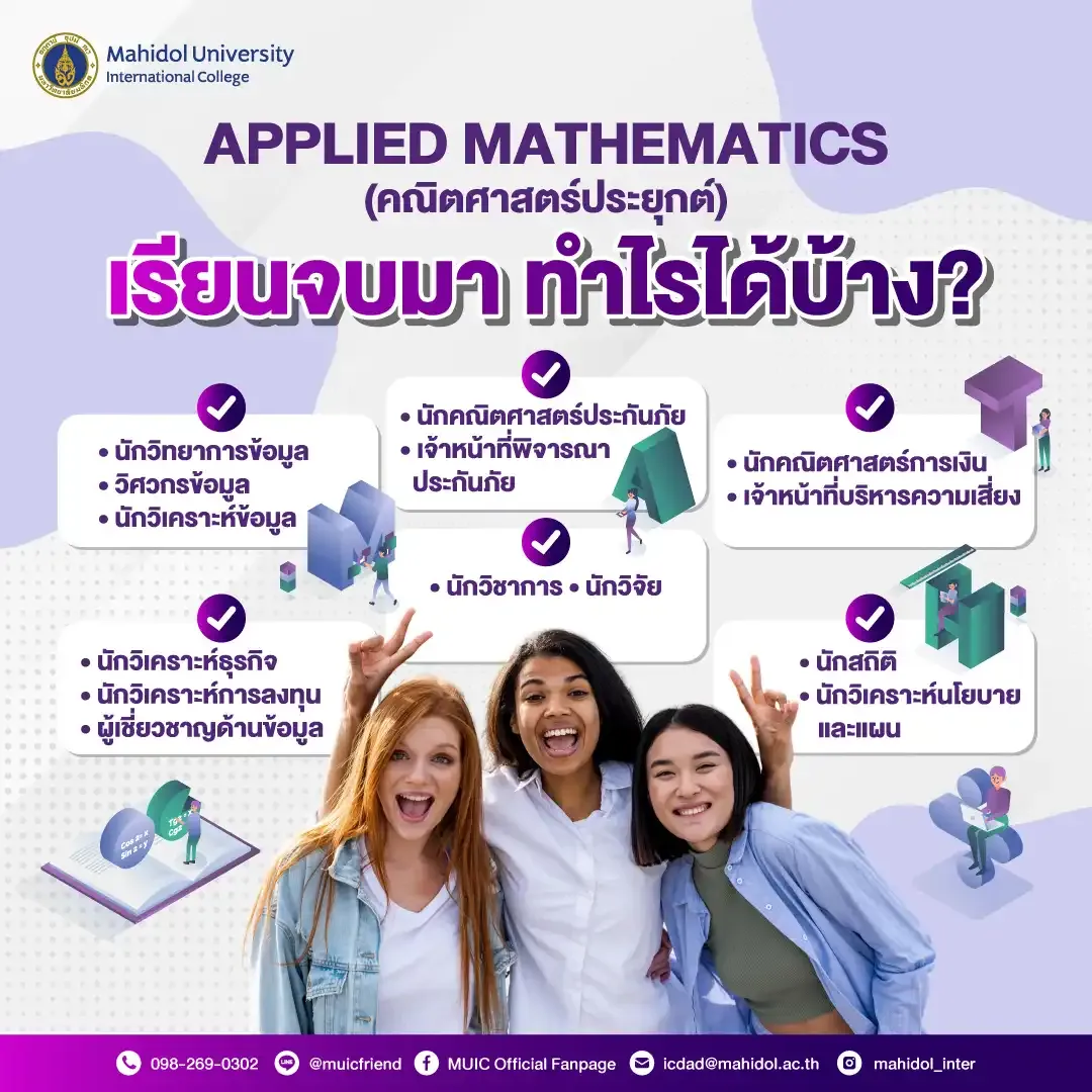 น้องๆคนไหนที่กำลังสนใจจะเรียนสาขาวิชา Applied Mathematics ที่ MUIC แต่ยังไม่แน่ใจว่าจบสาขาวิชานี้แล้วจะทำอาชีพอะไร วันนี้จะพามาทำความรู้จักสาขาวิชานี้ให้มากขึ้นกันค่ะ