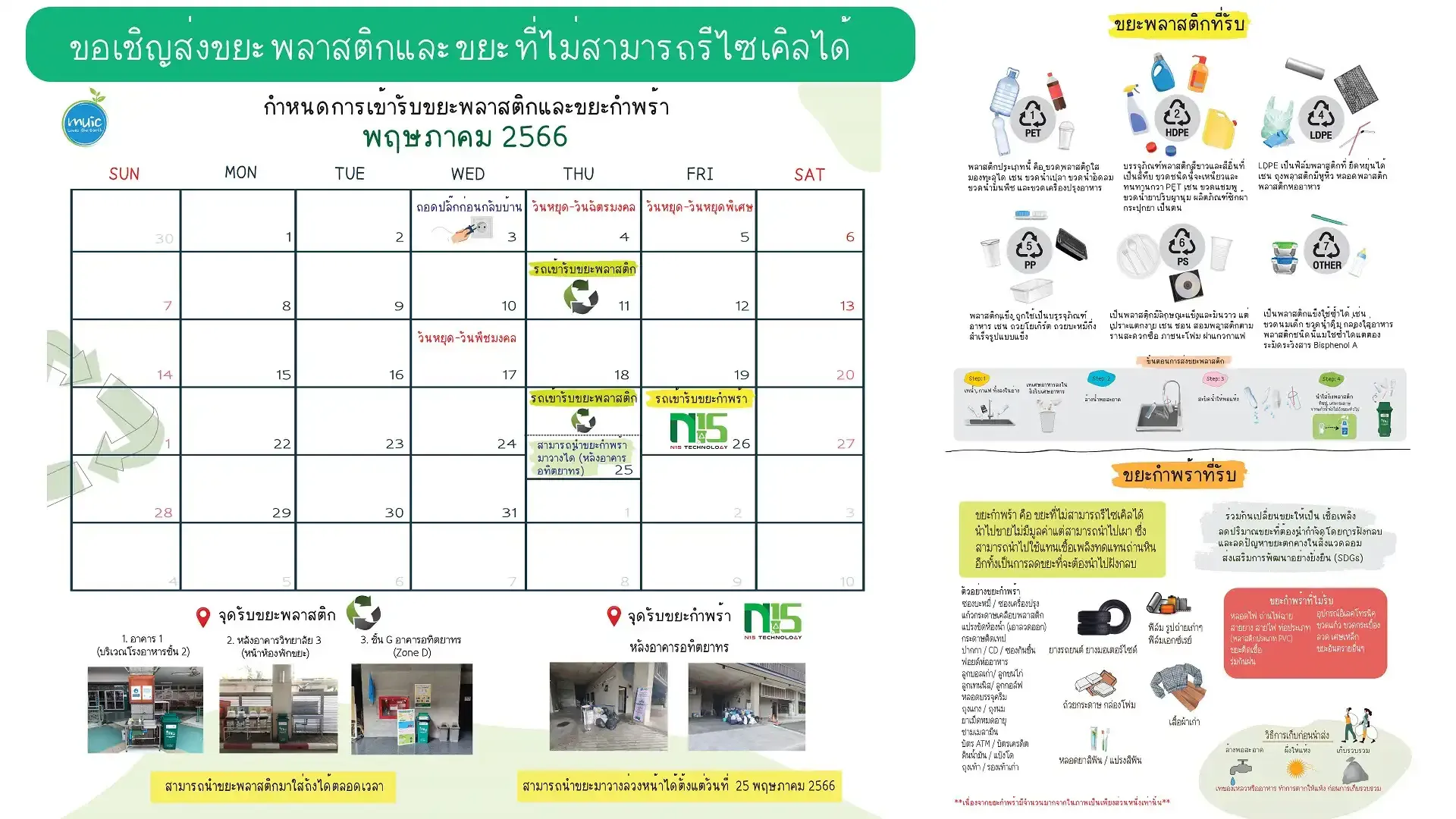 ขอเชิญเป็นส่วนหนึ่งในการช่วยรักษาสิ่งแวดล้อม โดยสามารถนำขยะพลาสติกที่ใช้แล้วใส่ถังรับขยะพลาสติก (ถังสีเขียว) เพื่อนำไปผ่านกระบวนการรีไซเคิลให้นำกลับมาใช้ประโยชน์ใหม่ได้ และขอเชิญส่งขยะกำพร้า (ขยะที่ไม่สามารถนำไปรีไซเคิลได้) เพื่อนำไปเปลี่ยนเป็นเชื้อเพลิง โดยสามารถนำมาส่งให้กับบริษัทได้ ในวันศุกร์ที่ 26 พฤษภาคม 2566 เวลา 9.00 – 12.00 น. อนึ่งสามารถนำขยะมาวางไว้ได้ล่วงหน้า ในวันที่ 25 พฤษภาคม 2566 บริเวณด้านหลังอาคารหลังอาคารอทิตยาทร (บริเวณห้องพักขยะ)