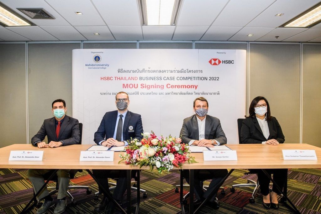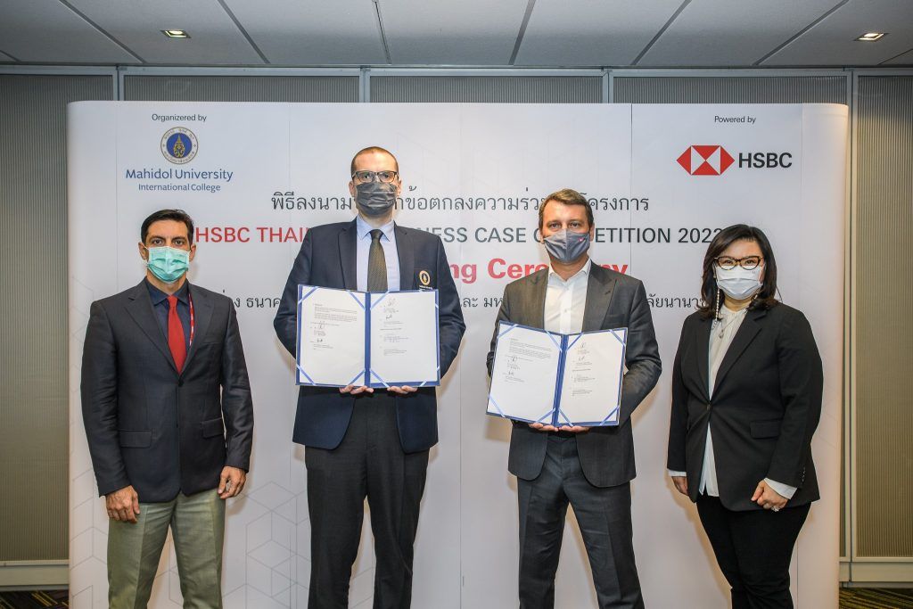 เมื่อวันที่ 21 เมษายน 2565 ผศ. ดร. Alexander Chabot Nanni รองคณบดีฝ่ายวิเทศสัมพันธ์ ผศ.ดร.Alessandro Stasi ประธานกลุ่มสาขาวิชาบริหารธุรกิจ วิทยาลัยนานาชาติ มหาวิทยาลัยมหิดล และนาย Giorgio Gamba ประธานเจ้าหน้าที่บริหาร นางสุดาพันธ์ ทวีธรรมสถิตย์ ประธานเจ้าหน้าที่บริหารธุรกิจตลาดเงิน ตลาดทุน ธนาคารเอชเอสบีซี ประเทศไทย ร่วมลงนามบันทึกข้อตกลงความร่วมมือ (MOU) โครงการประกวดสุดยอดวิเคราะห์และทำแผนธุรกิจระดับสากล HSBC Thailand Business Case Competition 2022 ณ อาคาร HSBC ถนนพระราม 4 กรุงเทพฯ