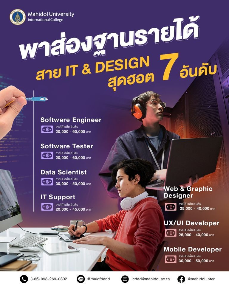 และถ้าน้องๆ อยากได้เงินเดือนเริ่มต้นที่ปังๆ แบบนี้ ที่ Creative Technology Major ของ MUIC ก็พร้อมช่วยดันน้องๆ ให้ได้เป็น Developer ชื่อดัง มีโอกาสได้ร่วมงานกับคนเก่งๆ จากทั่วโลก โดยหลักสูตรของเราจะอัดแน่นไปด้วยความรู้อัปเดตใหม่ๆ ให้ตอบโจทย์โลกดิจิทัล แถมเน้นให้น้องๆ ไปลองลงมือปฏิบัติจริง รับรองว่าจะช่วยให้น้องๆ ได้ Upskill พร้อมทำงานทันทีแน่นอน