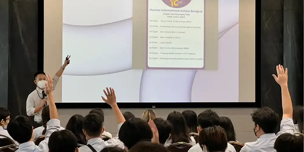 เมื่อวันที่ 7 มิถุนายน ที่ผ่านมา คณะครูและนักเรียนจากโรงเรียนโรงเรียน นานาชาติฮาร์โรว์กรุงเทพฯ (Harrow International School Bangkok) จำนวน 120 คน เข้าเยี่ยมชมวิทยาลัยนานาชาติ มหาวิทยาลัยมหิดล เพื่อรับฟังบรรยายแนวทางการศึกษาต่อในระดับปริญญาตรี รายละเอียดหลักสูตรที่เปิดสอนและวิธีการเลือกคณะที่เหมาะกับตนเอง ณ ห้องจรินทร์ยารัศมิ์ อาคารอทิตยาทร วิทยาลัยนานาชาติ มหาวิทยาลัยมหิดล