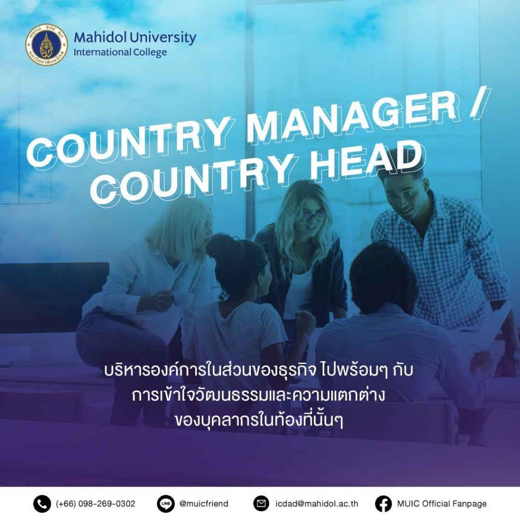 สำหรับน้องๆ คนไหนที่มีความตั้งใจและอยากเติบโตขึ้นสู่อาชีพ Country Manager / Country Head ต้องบอกเลยที่ MUIC เรามีวิชาเฉพาะด้านที่เหมาะสำหรับการเติมเต็มความฝันน้องๆ อย่างแน่นอน ไม่ว่าจะเป็นวิชา Management and Organizational Behavior (ICMB 235), Human Resources Management (ICMB 236), Diversity, Cross Culture and Expatriate Management (ICMI 332), Risk Management in International Business (ICMI 431) และ Internationalization Strategy (ICMI 432) เป็นต้น