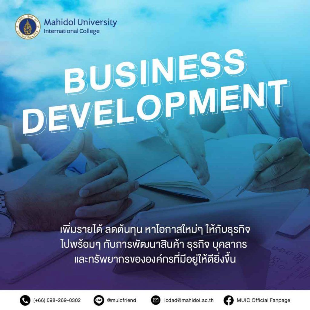 Business Development ตอบโจทย์สำหรับน้องๆ International Business ได้เป็นอย่างดีแน่นอน เนื่องจากต้องใช้ความรู้ความสามารถด้านธุรกิจและการบริหารเป็นอย่างดีแล้ว สำหรับอาชีพ Business Development หากมีความรู้ด้านการวิเคราะห์และเศรษฐศาสตร์ก็จะยิ่งตอบโจทย์ ที่ MUIC เรามีวิชาเฉพาะด้านสำหรับน้องๆ ที่สนใจอาชีพนี้เป็นอย่างดี ไม่ว่าจะเป็น