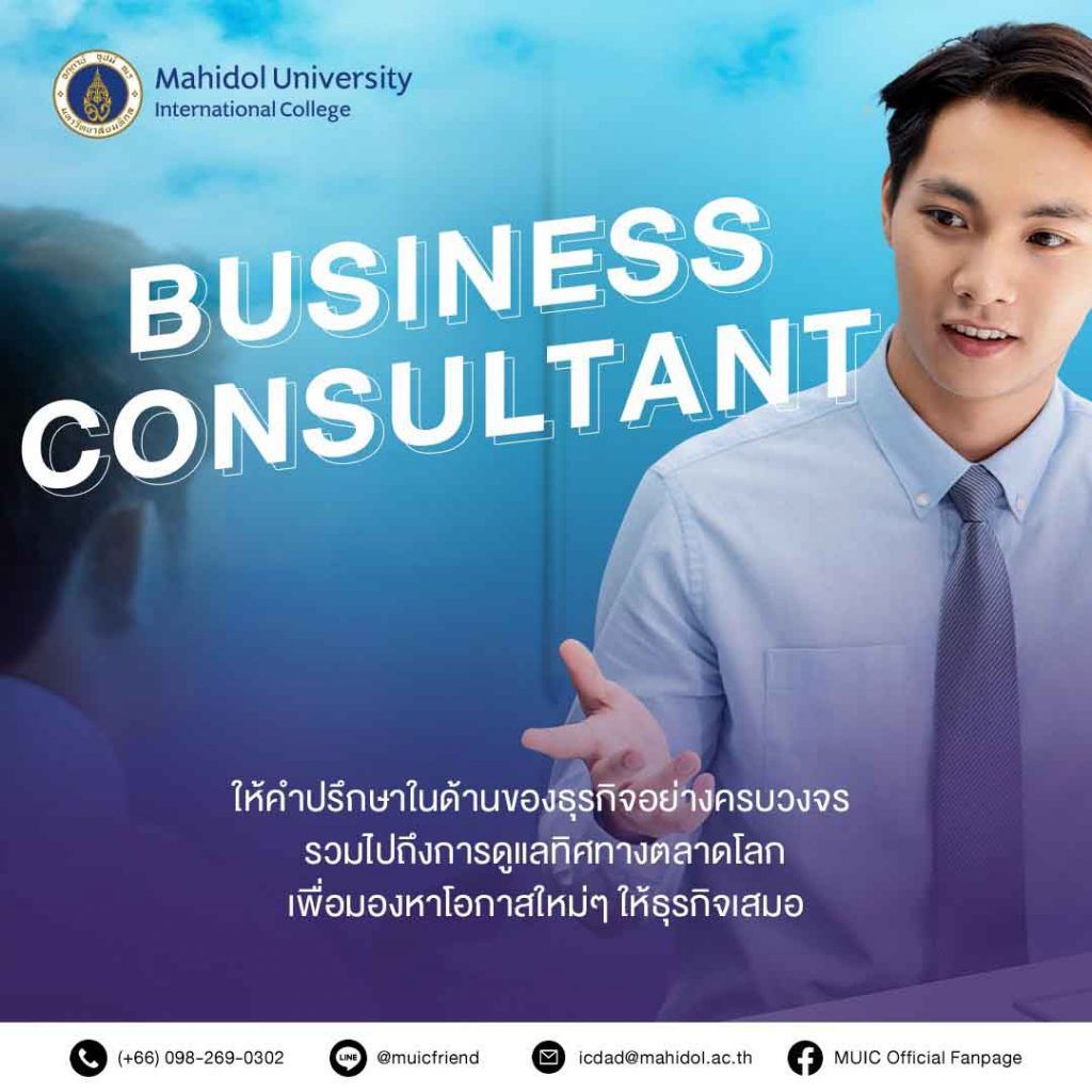 Business Consultant เป็นอีกหนึ่งอาชีพที่เป็นที่ต้องการของตลาดแรงงานไม่ว่าจะเป็นในระดับประเทศหรือระดับโลกก็ว่าได้ เนื่องจากในปัจจุบันมีการเติบโตของธุรกิจต่างๆ อย่างก้าวกระโดด ไม่ว่าบริษัทไหนๆ ก็ย่อมอยากได้ที่ปรึกษาทางธุรกิจที่จะพาให้ธุรกิจประสบความสำเร็จนั่นเอง ซึ่งอาชีพ Business Consultant จะทำหน้าที่ในการให้คำปรึกษาในด้านของธุรกิจอย่างครบวงจร รวมไปถึงการดูแลทิศทางตลาดโลกเพื่อมองหาโอกาสใหม่ๆ ให้ธุรกิจเสมอ