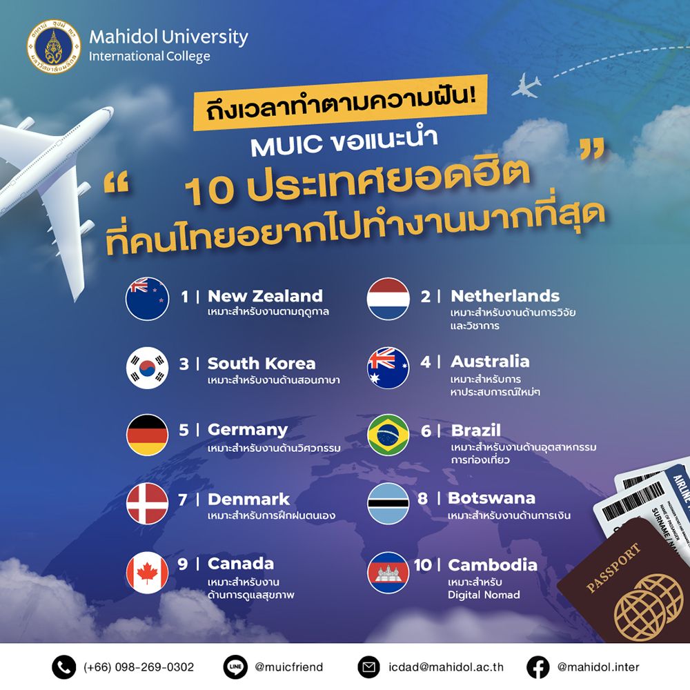 - วันนี้ MUIC จะมาแนะนำ “10 ประเทศยอดฮิตที่คนไทยอยากไปทำงานมากที่สุด” ประจำปี 2022